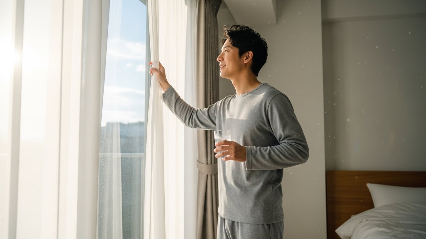 起きたらすぐにカーテンを開けます。曇りの日でも構いません。外の光を目に入れることで、体内時計がリセットされます。「朝が来た」と体に教えるだけのシンプルな作業ですが、スマホをダラダラ見る時間をこれに置き換えるだけで、頭のクリアさが違います。