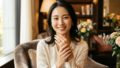 [アマラアミュレット リングを身につけ、ツインレイとの結ばれる運命を信じて笑顔を見せる女性 ※画像はイメージです]