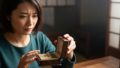 [木漏れ日の中でアマラアミュレットを見つめ、安心した表情を浮かべる20代日本人女性のイメージ ※画像はイメージです]